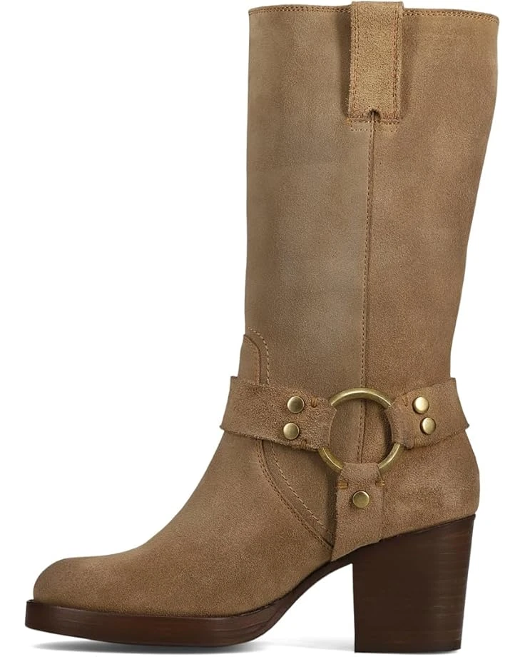 - The Frye® Jean Harness Boot, a must-have this season. Crafted from luxurious leather with suede accents, it boasts a sleek almond toe and effortless pull-on design. The cork outsole offers lightweight comfort, while the mid-calf height adds a touch of urban chic. Perfect for transitioning from day to night, its moto-inspired harness detail and sturdy chunky heel exude timeless appeal.