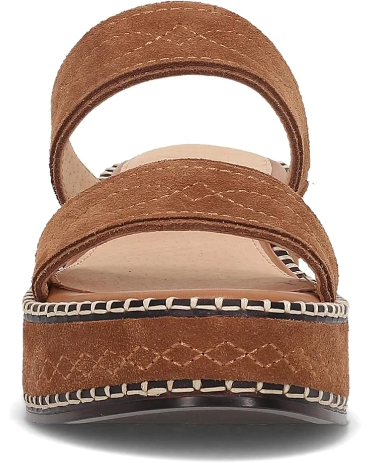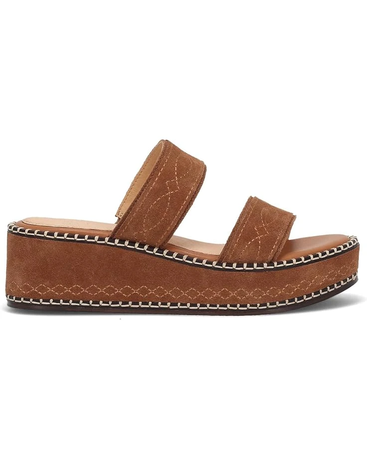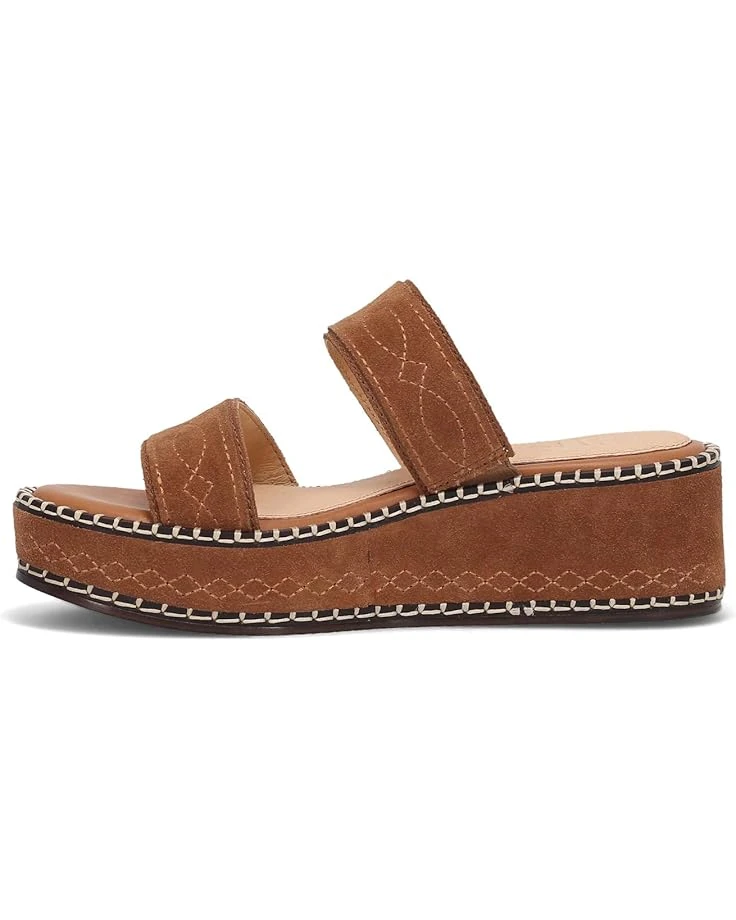 - Step into timeless elegance with the Frye® Joy Woodstock 2 Band sandal. Meticulously adorned with a chic jute wrap, it redefines classic heritage with modern stitching. The wedge construction and decorative arrow stitching provide a stylish lift, while the leather insole ensures comfort. Buckle up for sophistication.